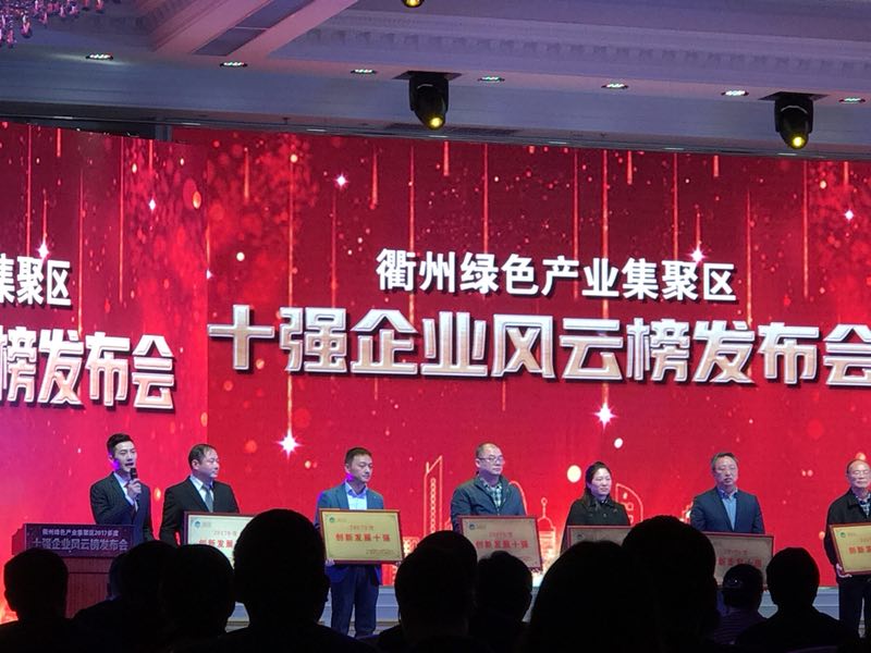 3月7日,衢州綠色產(chǎn)業(yè)集聚區(qū)表彰2017年度產(chǎn)值總量十強、企業(yè)上市十強等八批“企業(yè)風(fēng)云榜”上榜企業(yè),我公司獲得創(chuàng)新發(fā)展十強。